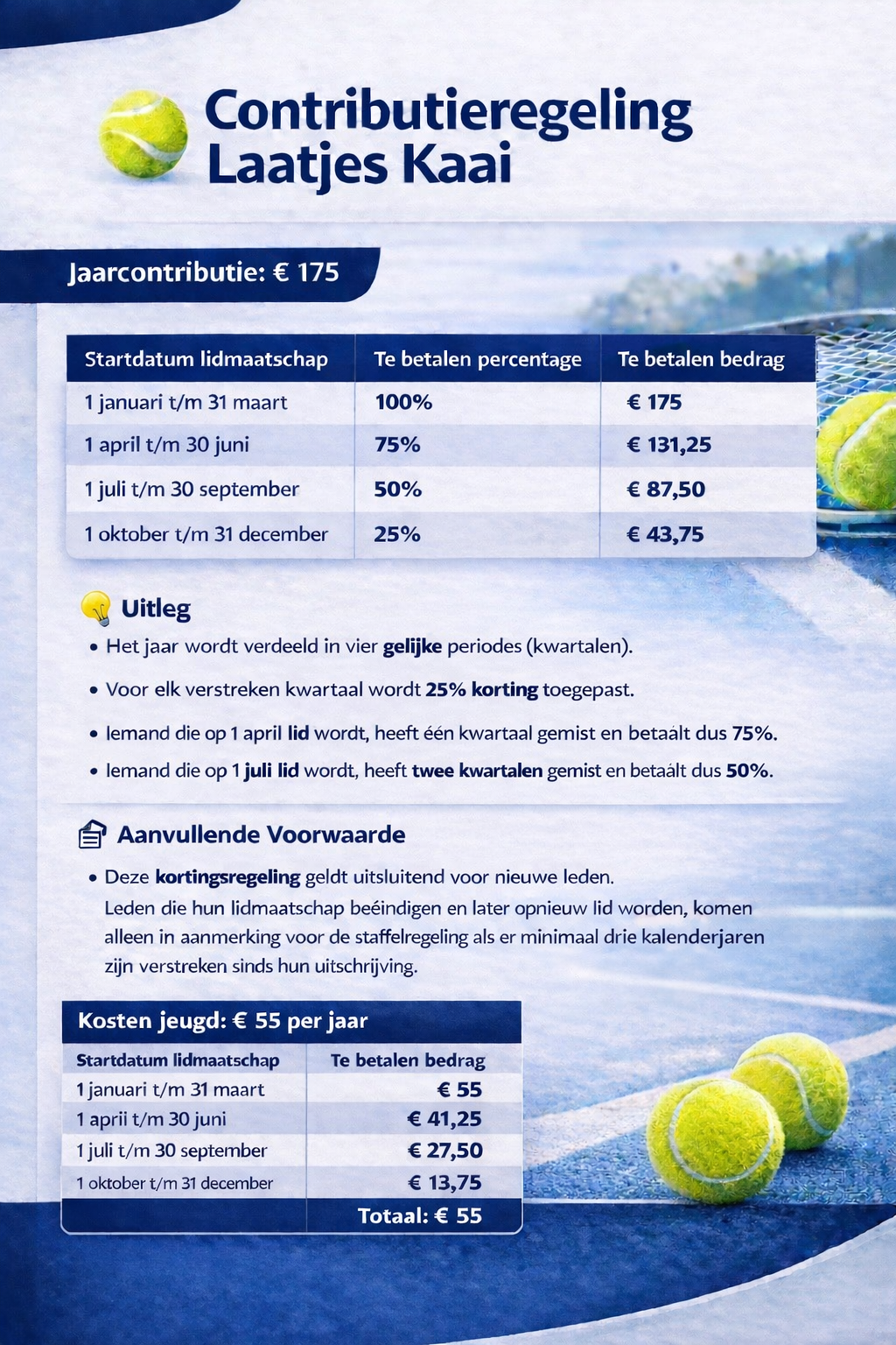 Let op: Betaling van de contributie is altijd voor 1 tennisseizoen en loopt altijd van 1 jan - 31 dec.