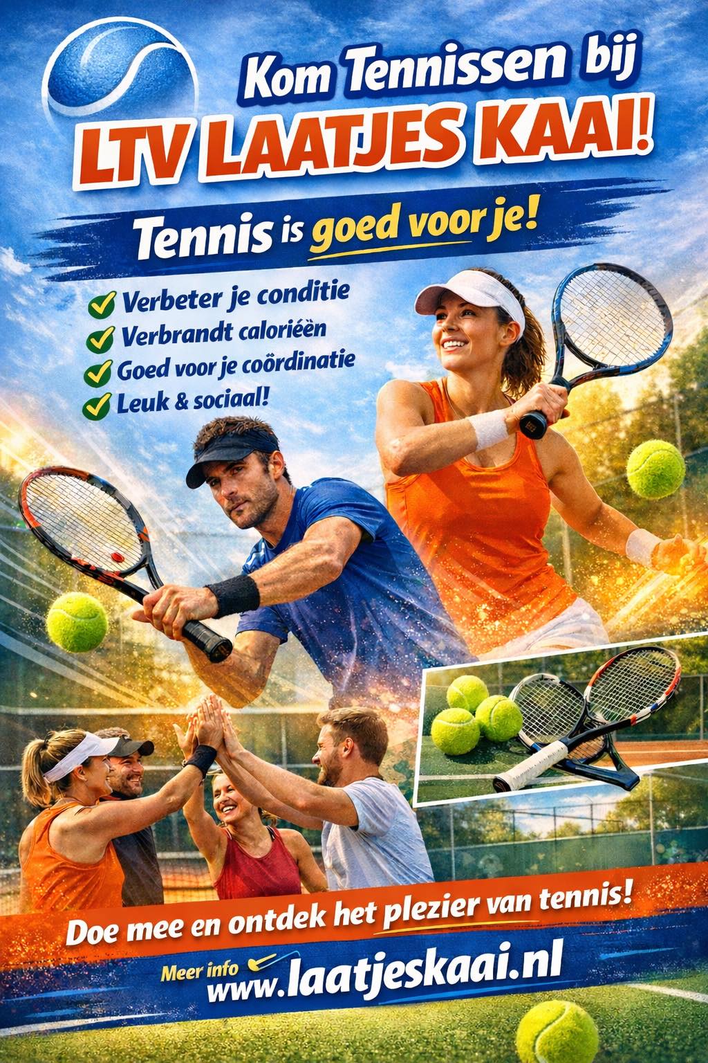 Tennis geeft je energie. Tennis geeft je plezier. Tennis geeft je gezondheid een boost. En dat allemaal bij tennisvereniging Laatjes Kaai.